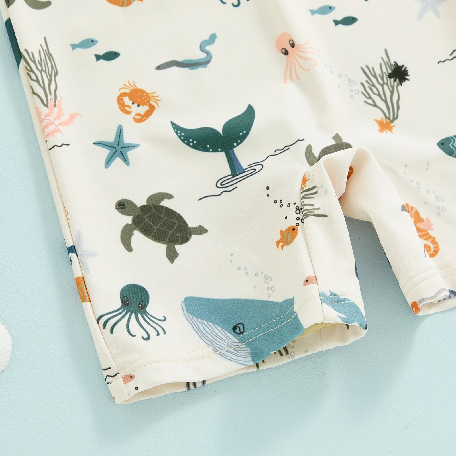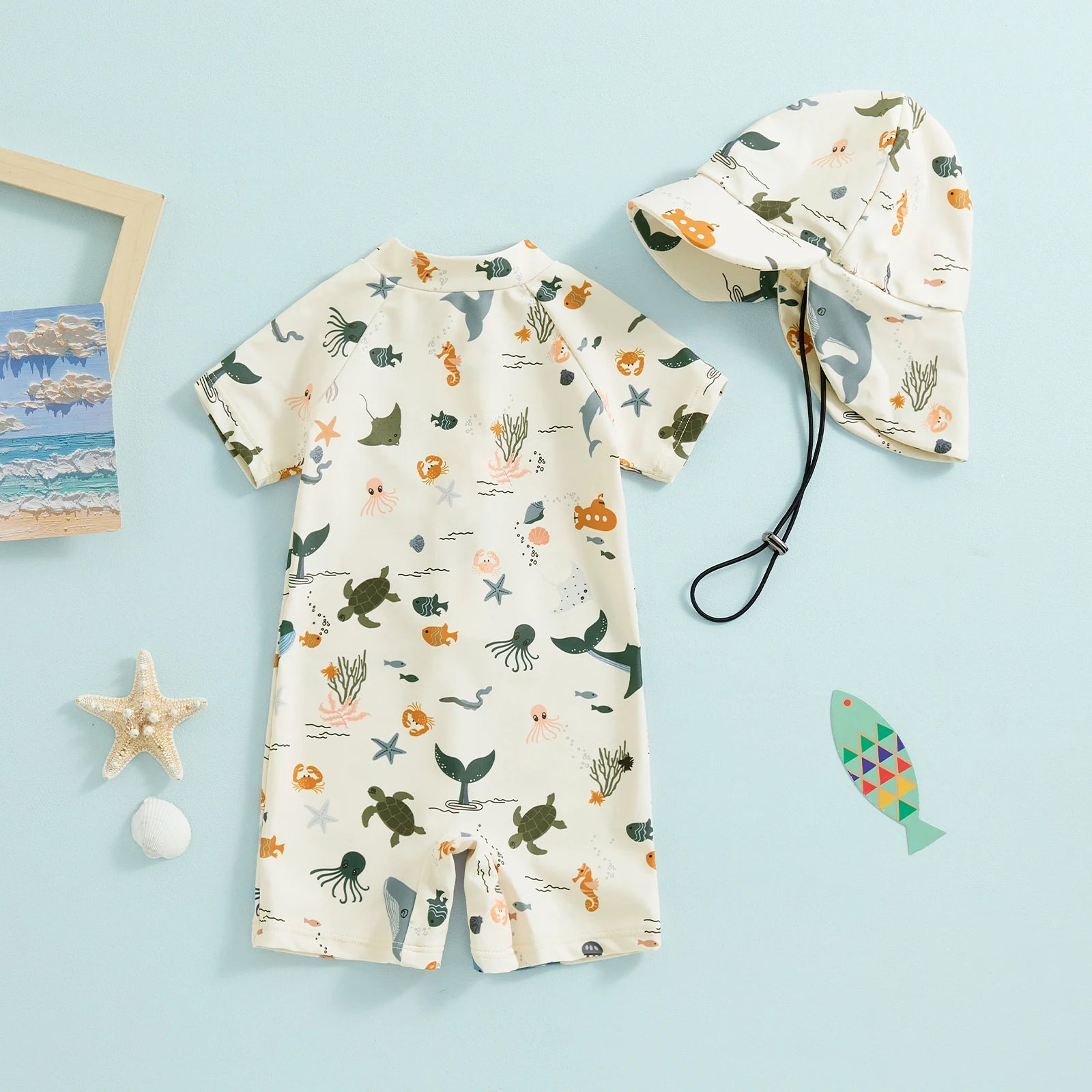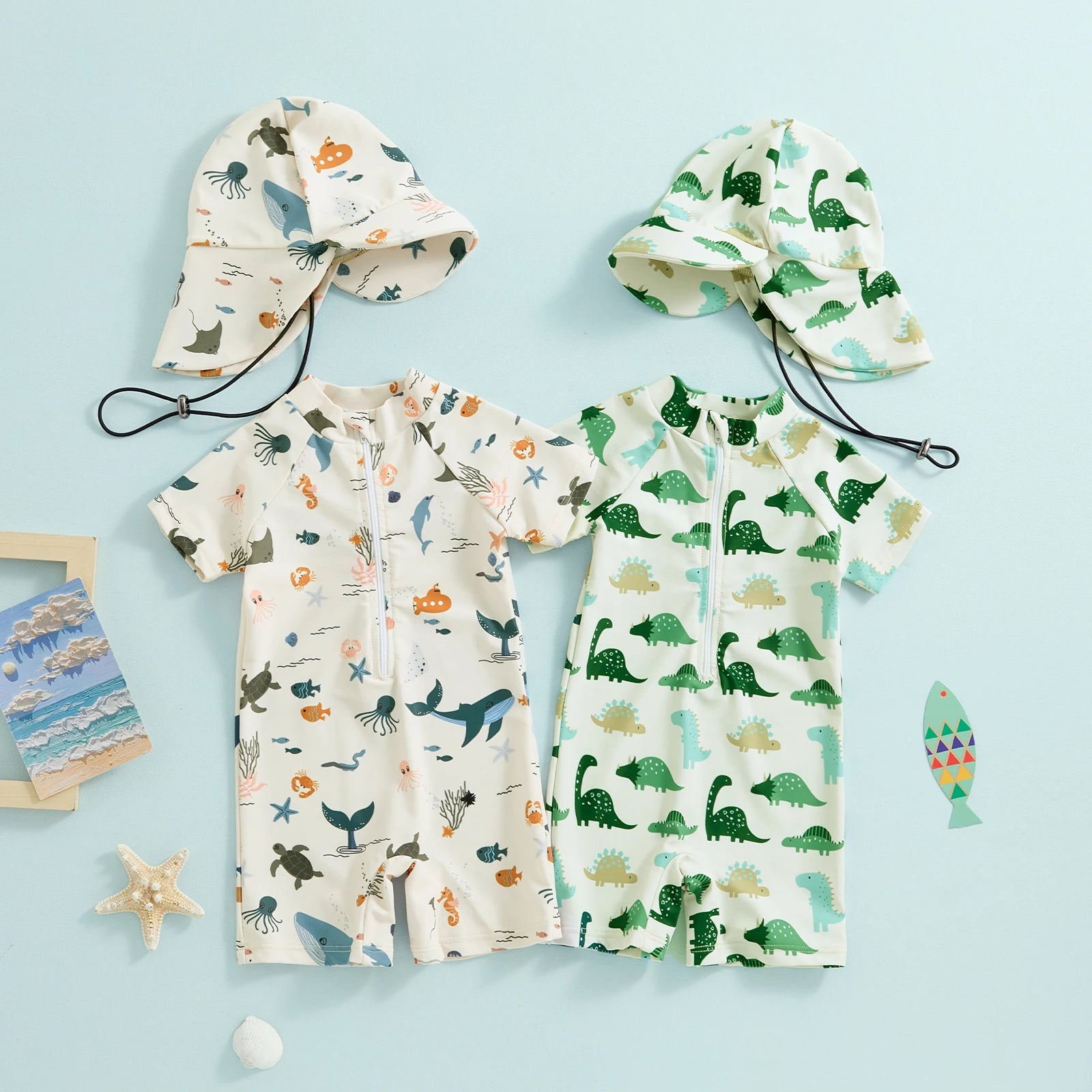 Infant Baby Boys Swimsuit Sun Protection Bathing Suit Toddler Short Sleeve Animal Print Zipper Swimwear + Hat Children Beachwear