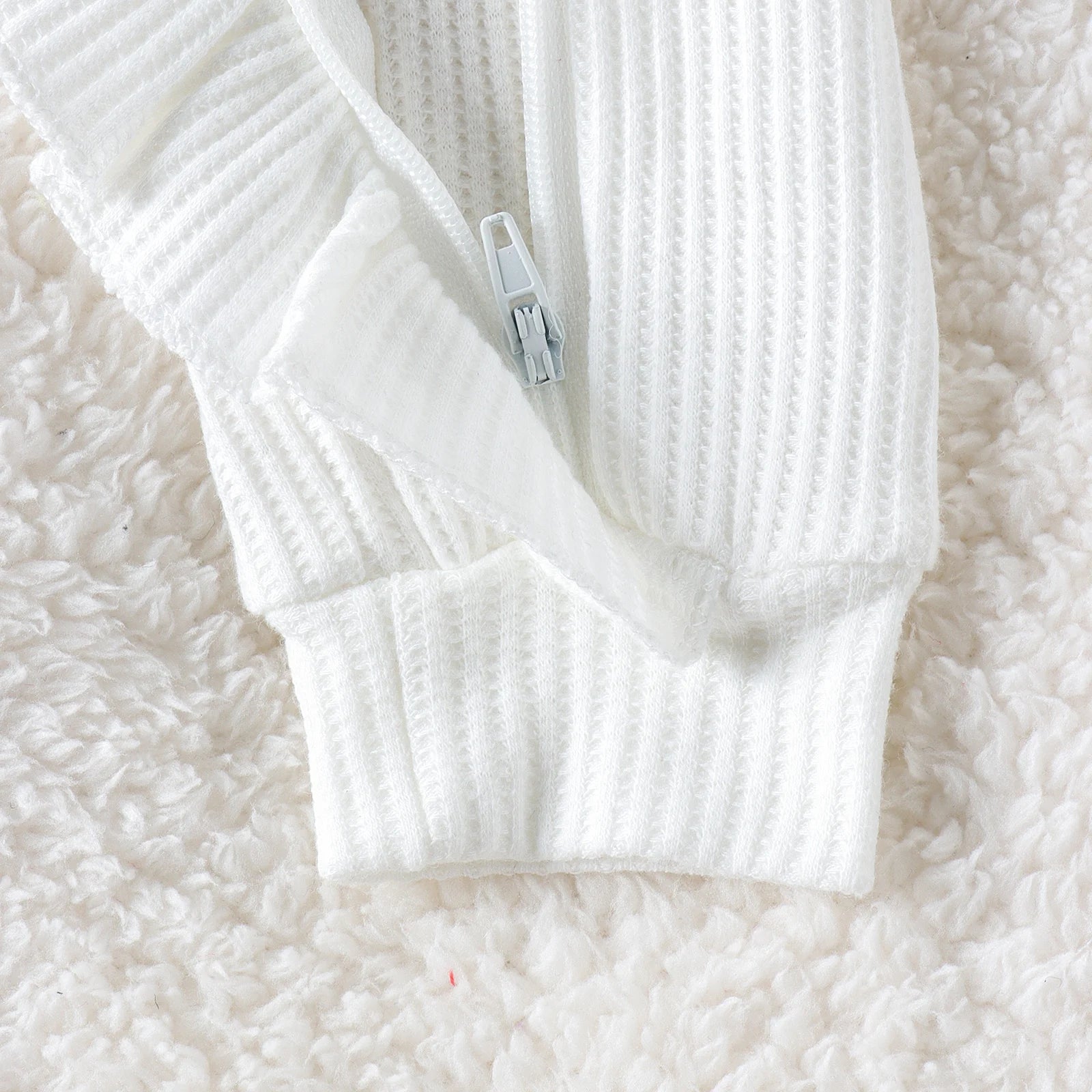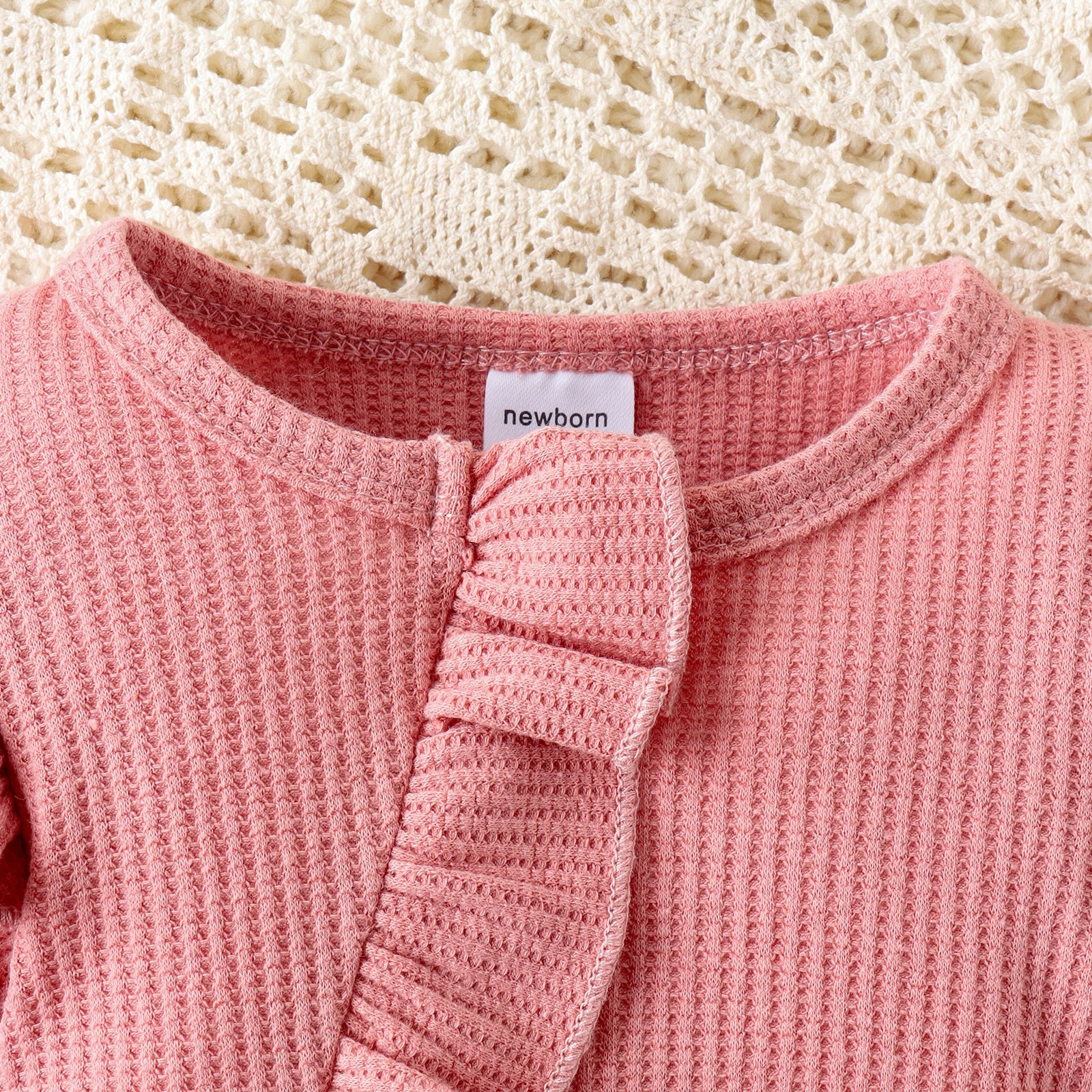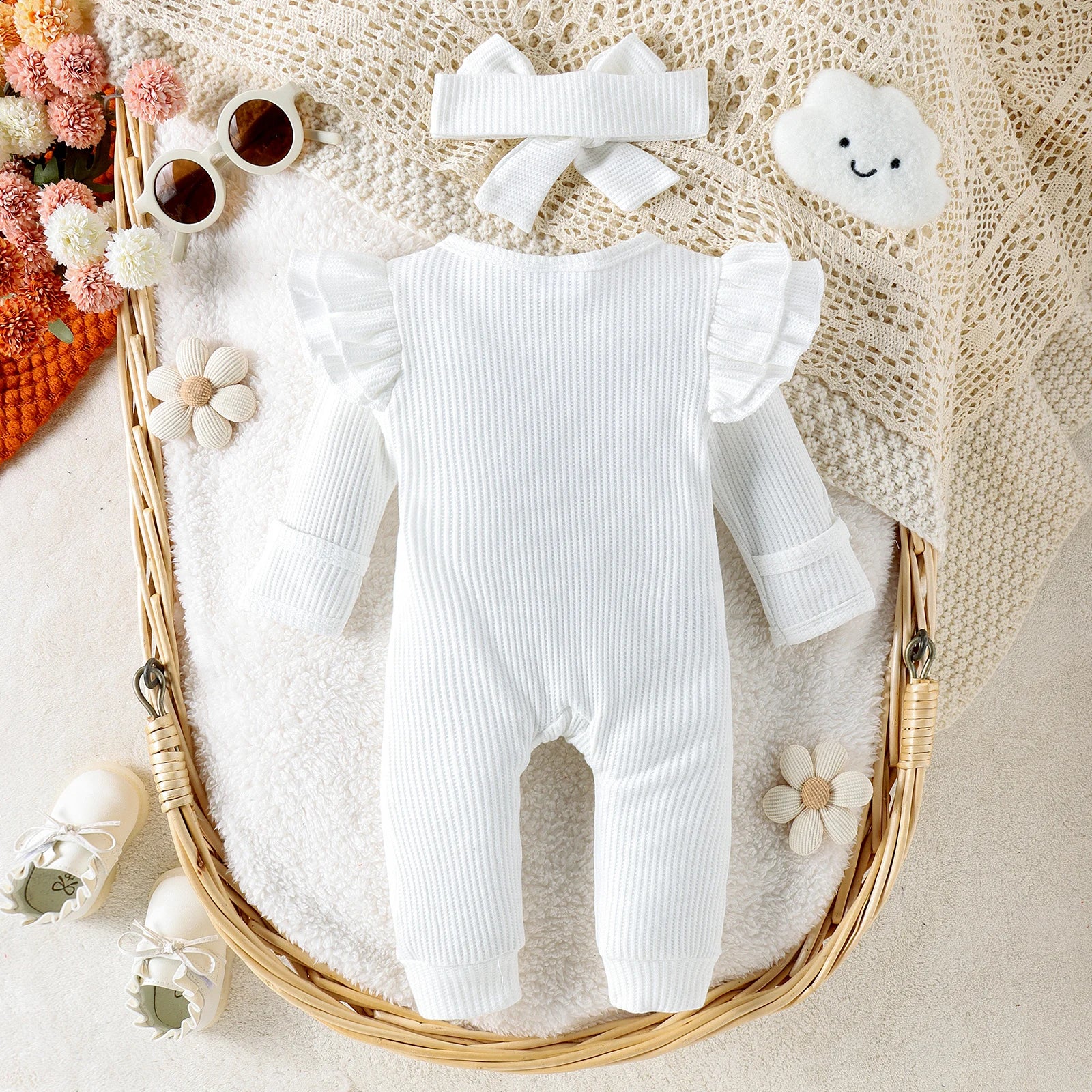 2PCS Autumn New Style 0-1 Year Old Girl Baby Sweet And Cute Solid Color Flying Sleeve Waffle Long-Sleeved Jumpsuit + Hair Band