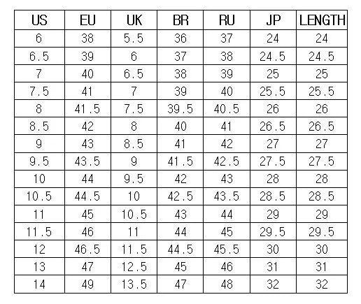size_info: {"sizeInfoList":[{"length":{"cm":"23.5","inch":"9.25"},"size":"5.5","vid":200000286},{"length":{"cm":"24","inch":"9.45"},"size":"6","vid":1394},{"length":{"cm":"24.5","inch":"9.65"},"size":"6.5","vid":200000287},{"length":{"cm":"25","inch":"9.84"},"size":"7","vid":3434},{"length":{"cm":"25.5","inch":"10.04"},"size":"7.5","vid":200000288},{"length":{"cm":"25.5","inch":"10.04"},"size":"8","vid":699},{"length":{"cm":"26","inch":"10.24"},"size":"8.5","vid":200000289},{"length":{"cm":"26.5","inch":"10.43"},"size":"9","vid":350262},{"length":{"cm":"27","inch":"10.63"},"size":"9.5","vid":200000290},{"length":{"cm":"27.5","inch":"10.83"},"size":"10","vid":1583},{"length":{"cm":"28","inch":"11.02"},"size":"10.5","vid":200000291},{"length":{"cm":"28.5","inch":"11.22"},"size":"11","vid":100010420},{"length":{"cm":"29","inch":"11.42"},"size":"11.5","vid":200000292},{"length":{"cm":"29.5","inch":"11.61"},"size":"12","vid":1663},{"length":{"cm":"30-31","inch":"11.81-12.20"},"size":"13","vid":200000296},{"length":{"cm":"31-32","inch":"12.20-12.60"},"size":"14","vid":200000298}]}