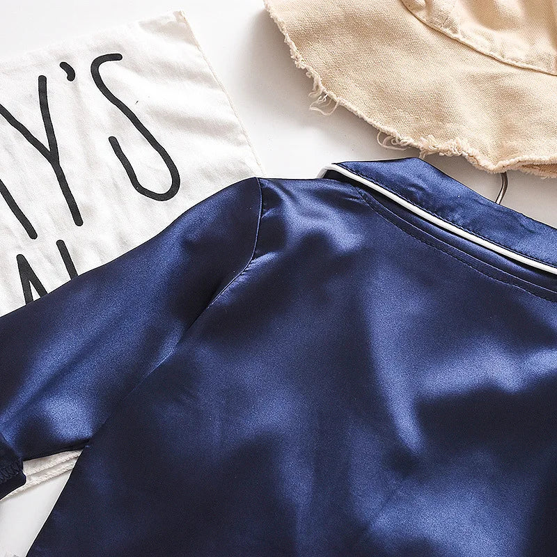 Korean version of childrens pajamas set silk satin long sleeve top+trousers two -piece male baby girl cartoon solid color set