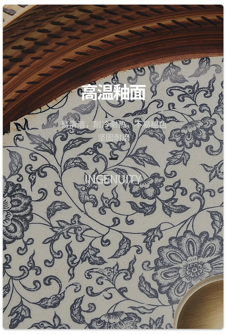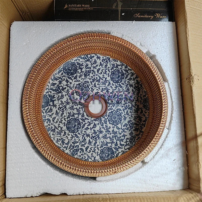 41*41*14cm European style Ceramic Washbasin Retro Printing Bathroom Sink Countertop Round Bowl Basin with Hardware Faucet Set