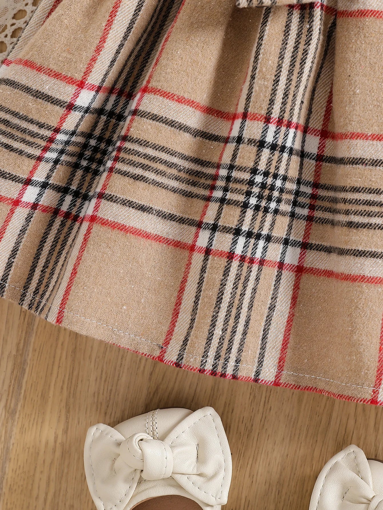 Baby Girl Summer Fashion Cute Casual Round Neck Ruffle Lace Decoration Short Sleeved Waist Large Bow Plaid Splicing Design