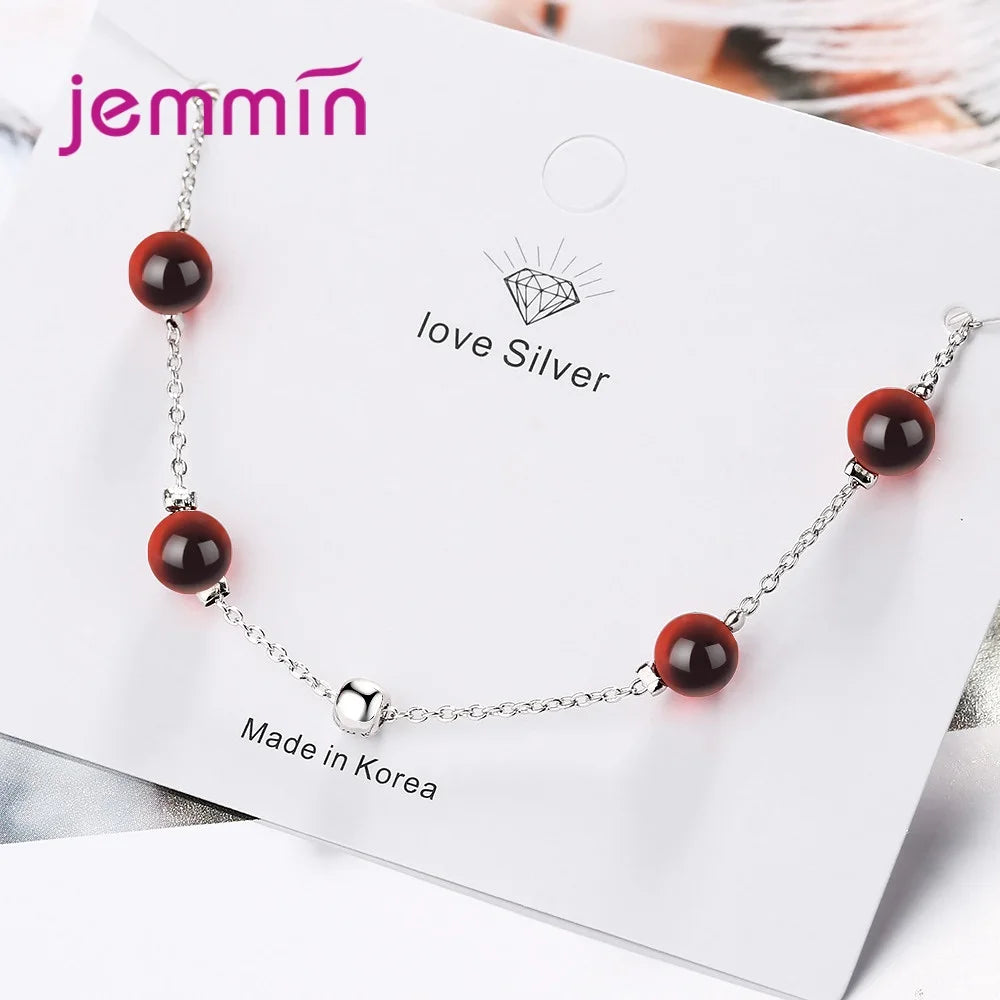 Charm 925 Sterling Silver Red Garnet Beads Chain Bangle&Bracelets for Women Girls Wedding Party Fashion Jewelry Gifts Accessory