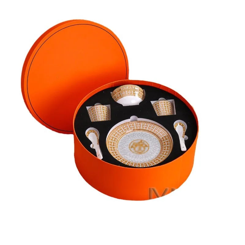 Luxury 10 piece set of European style gray H horse drawn cart tableware, circular gift box, bone china bowl, plate, spoon, plate