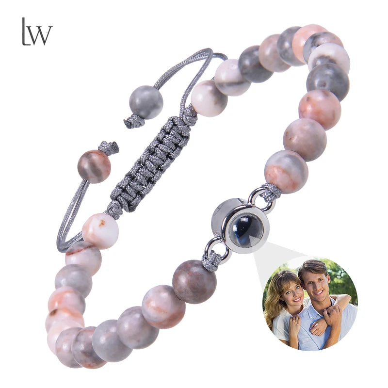 Natural Stone Beads Personalized Picture Bracelet Pink Zebra Stone Custom Photo Projection Bracelet Memorial Gifts for Women Men